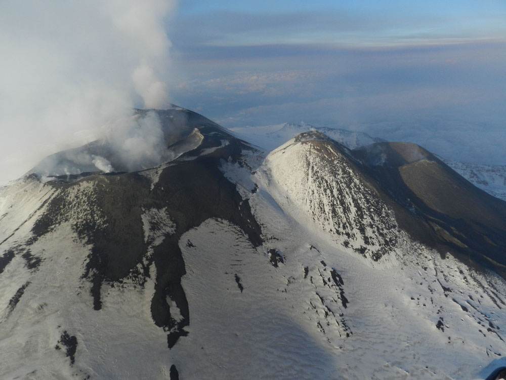 Aerial view of the summit craters of Etna on 4 March 2013, looking northeast. The former Central Crater, now occupied by the Bocca Nuova and the Voragine, is in the left part of the image, and further in the background is the Northeast Crater, currently the highest point on Etna (3329.6 m). The two cones of the Southeast Crater are to the right; the older and taller cone formed between the mid-1980s and 2007, whereas the new, dark and still lower cone at right has grown since the spring of 2011. Since this photo was taken, the new cone has grown significantly, nearly reaching the elevation of the old Southeast Crater cone by mid-November 2013 (Image credits: Boris Behncke).