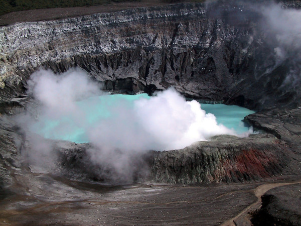 | Description: | The Poás Volcano, (Spanish: Volcán Poás), is an active 2,708-metre (8,885 ft) stratovolcano in central Costa Rica. It has erupted 39 times since 1828. It was showing intense degassing in mid-April 2013 from a fumarole field between the shore of the crater lake and the dome. The fumaroles of the dome, which had started a new heating cycle in early 2013, had a temperature of ∼500◦C. |