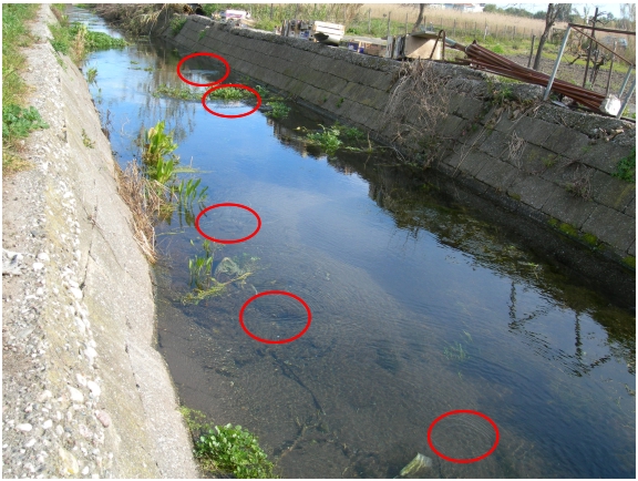 | Description: | This site is located very close to the Ionian Sea coast. It is an artificial water channel with bubbling gas at its bottom through cracks in the concrete floor. The area is into private land. Access is through a gate on a dirty road that starts from the road that goes from Fondachello to the park of Fiumefreddo river. |