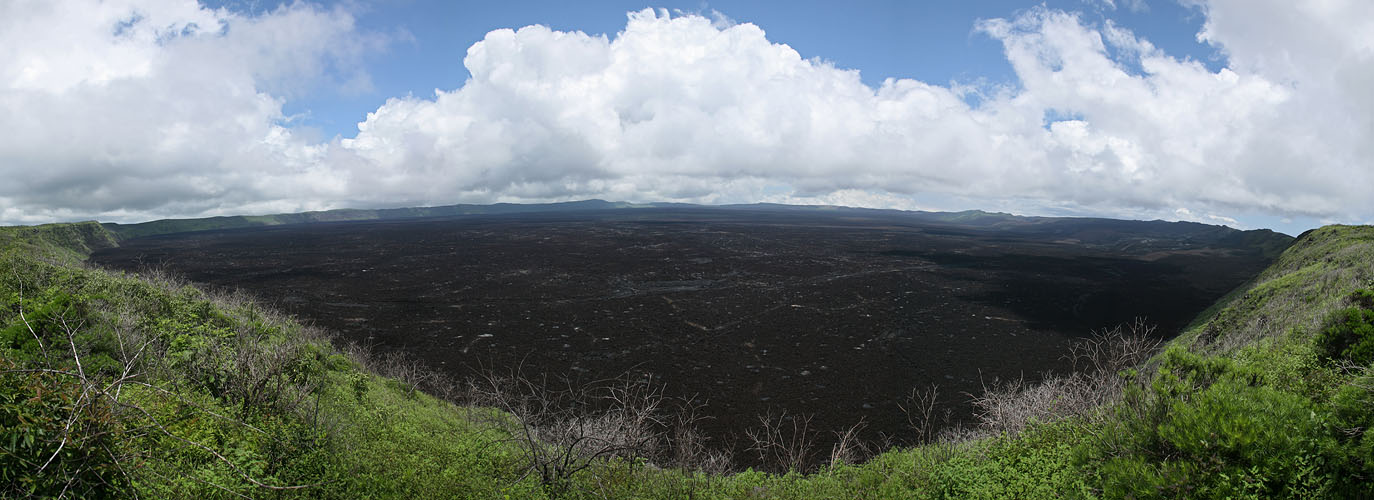 Sierra Negra Caldera. The entire floor of the caldera is covered by lava flows from the 2005 eruption with flows emanating from the slightly elevated fissure plateau on the far right of the picture.